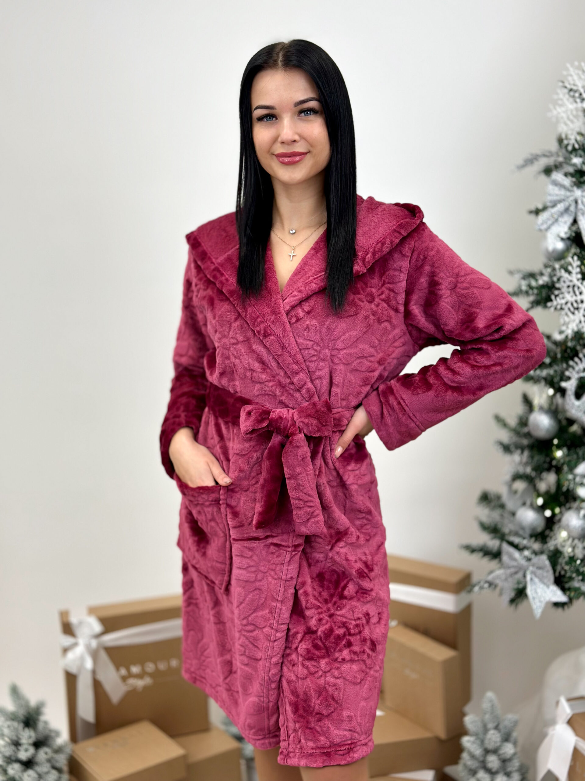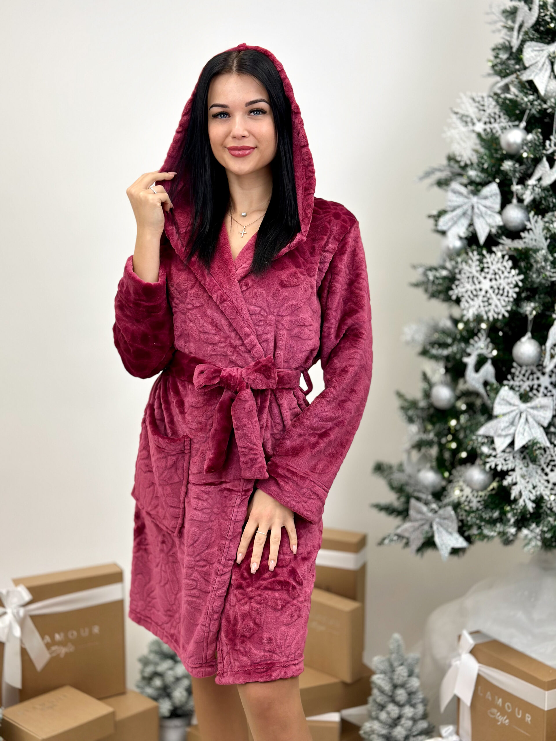 Cocoon sieviešu īsais halāts ir izgatavots no mīksta materiāla, kas nodrošina maksimālu komfortu un siltumu. Dizains ar kapuci nodrošina papildu komfortu, savukārt priekšējās kabatas ir praktiskas un funkcionālas. Josta nodrošina ērtu piegulšanos.