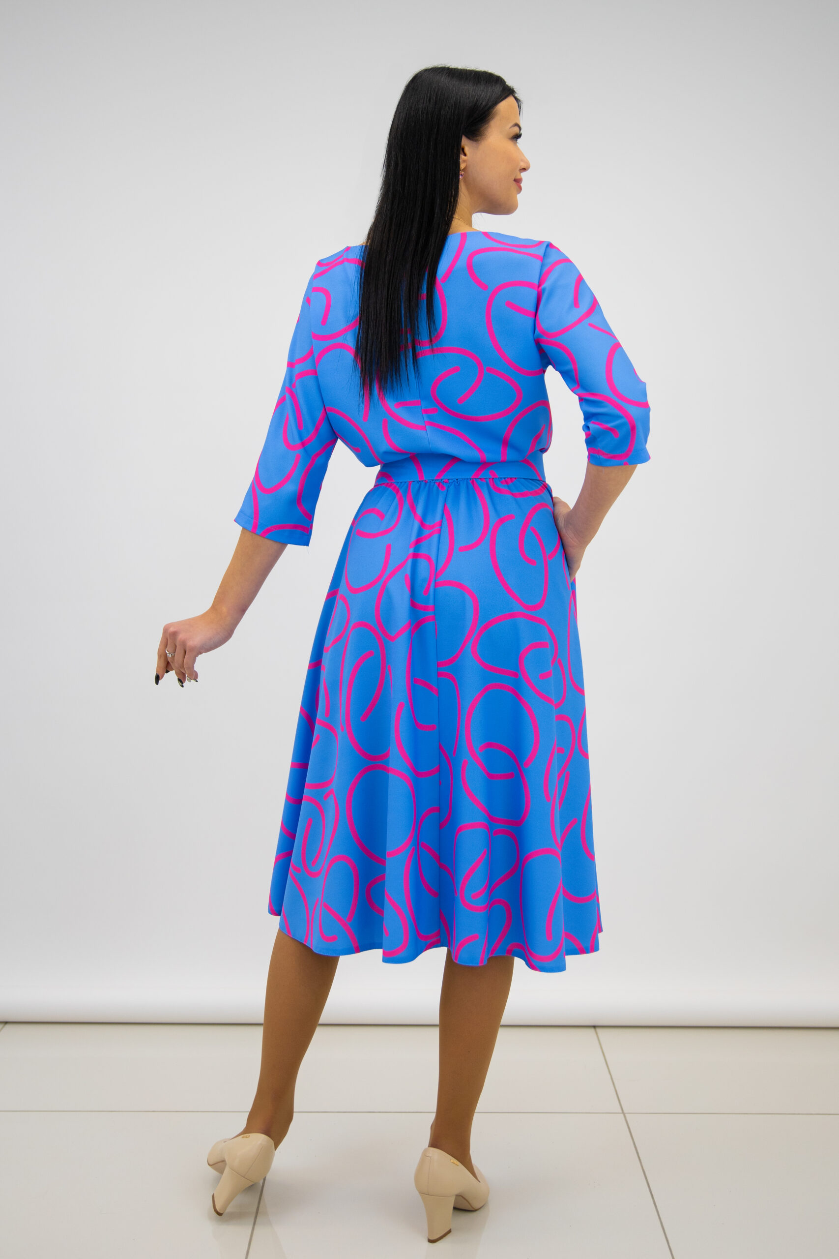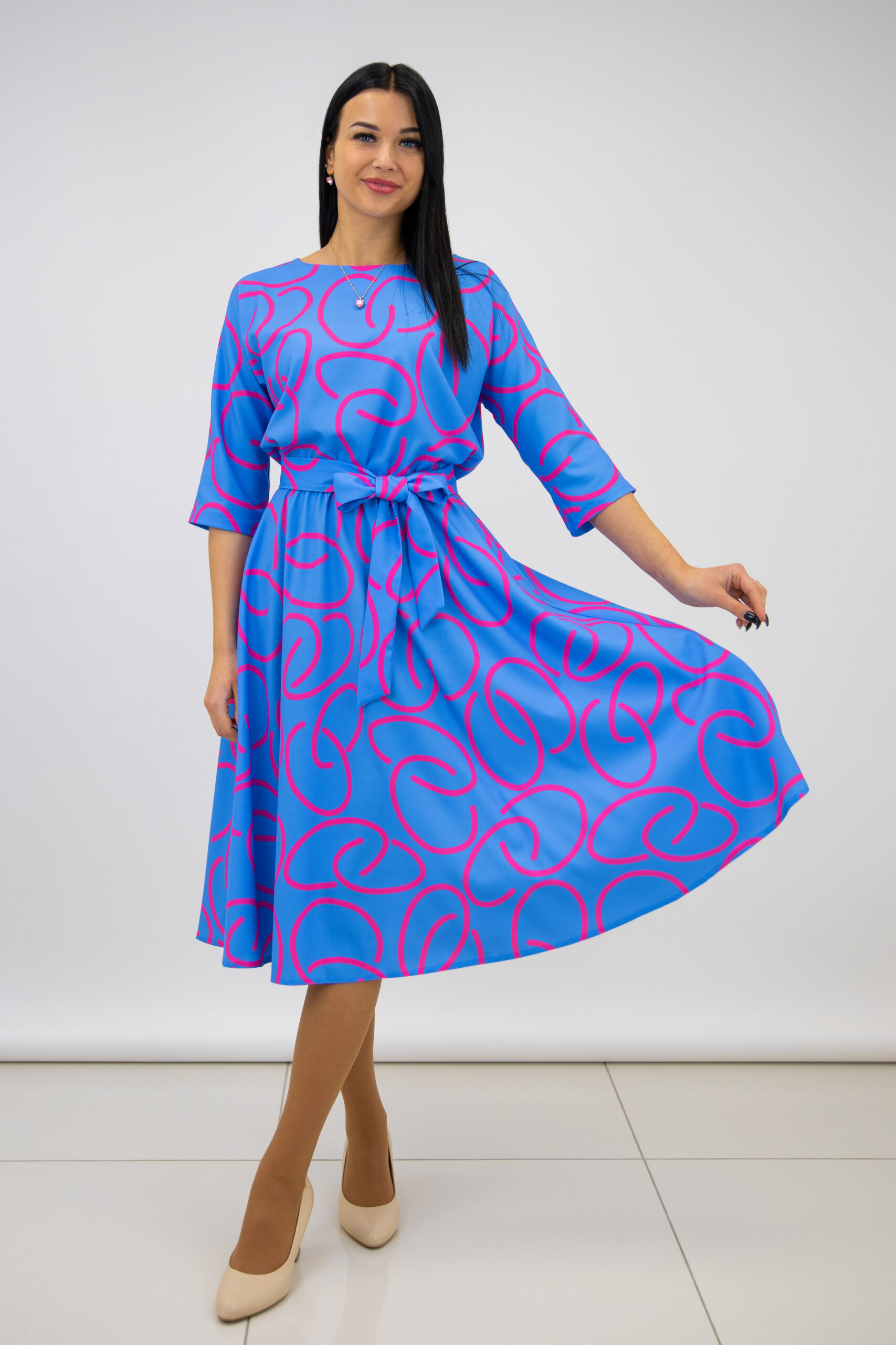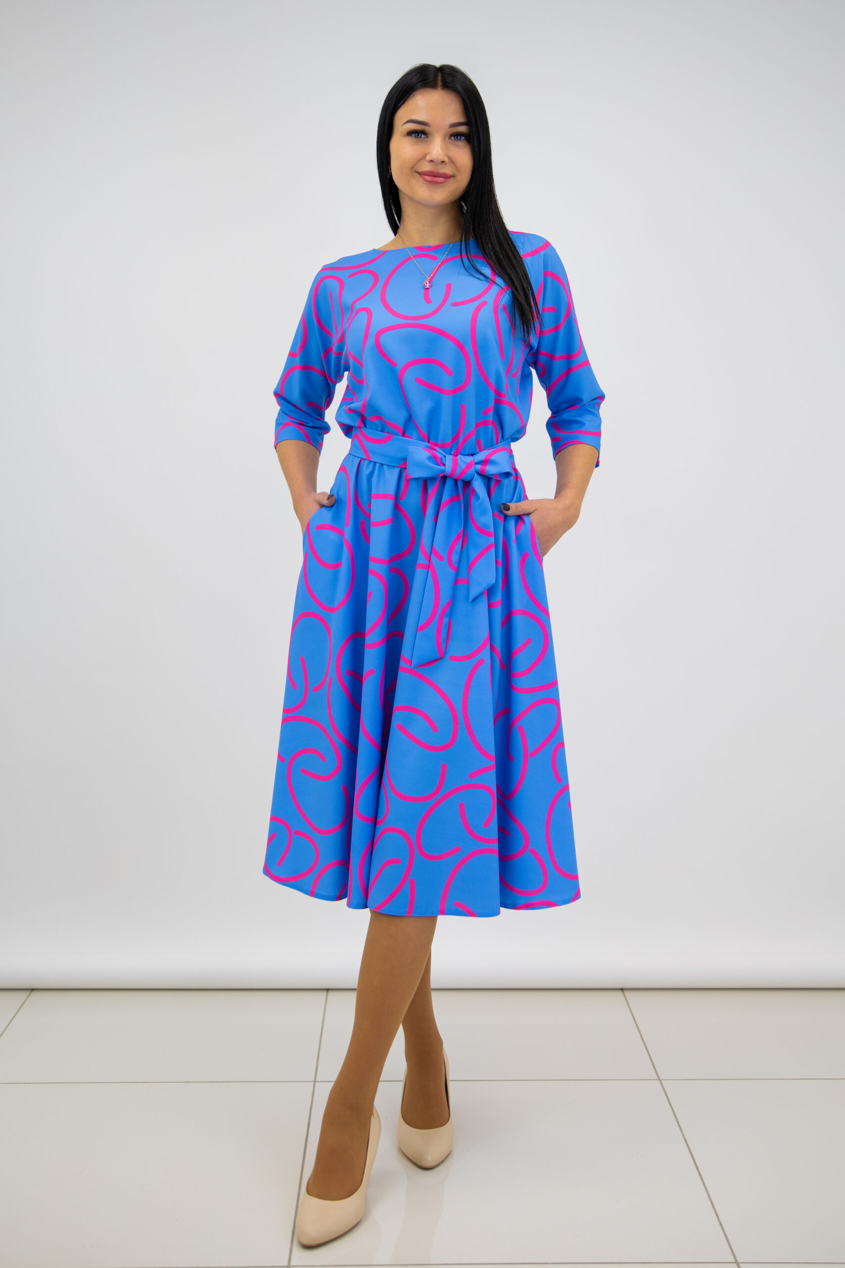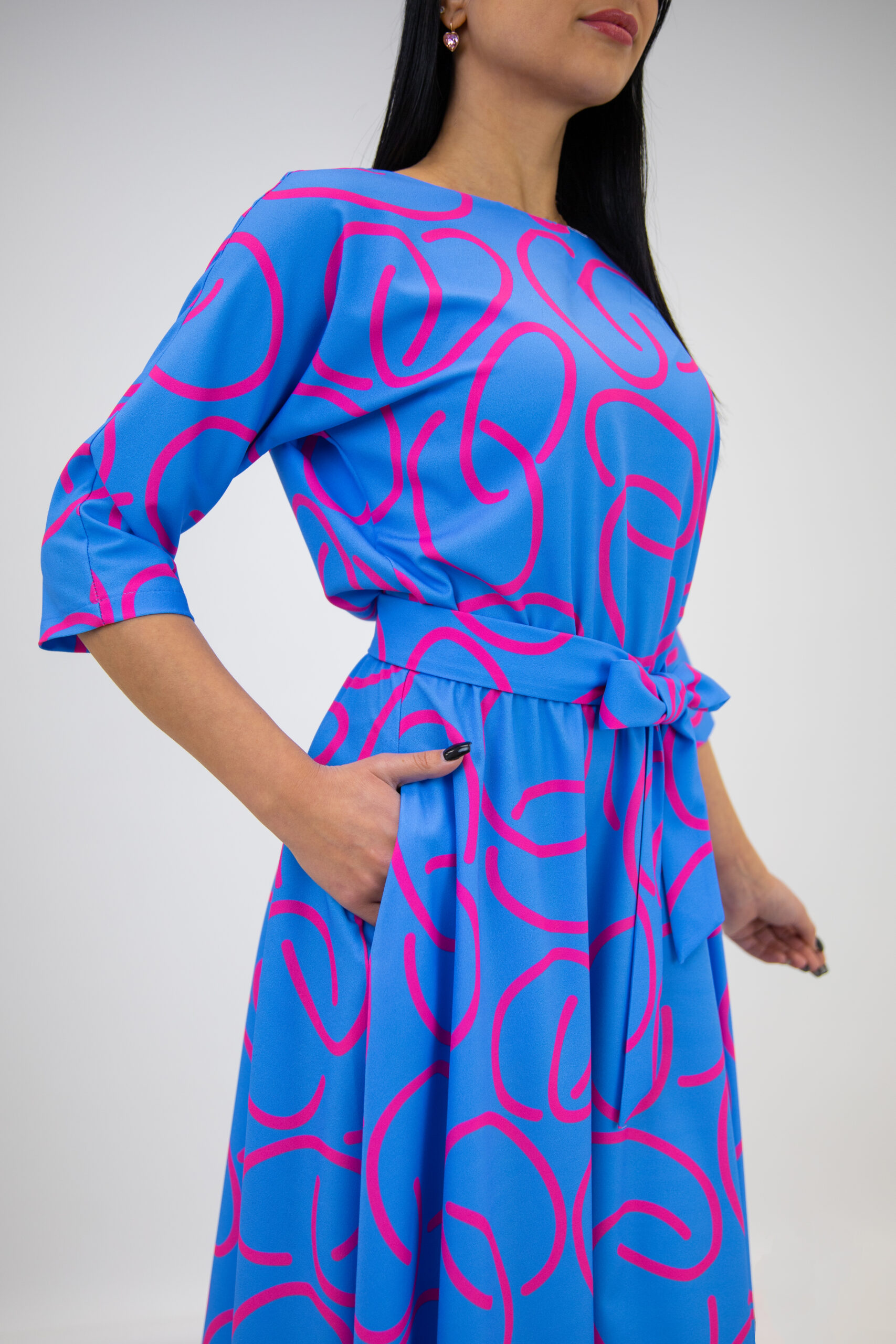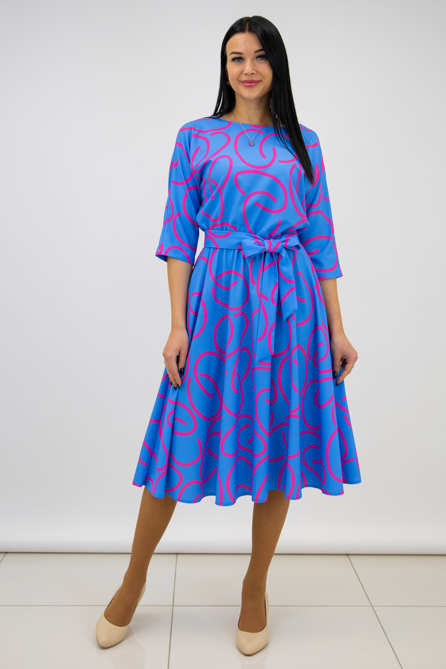 Saules griezuma kleita ar fuksijas rakstu